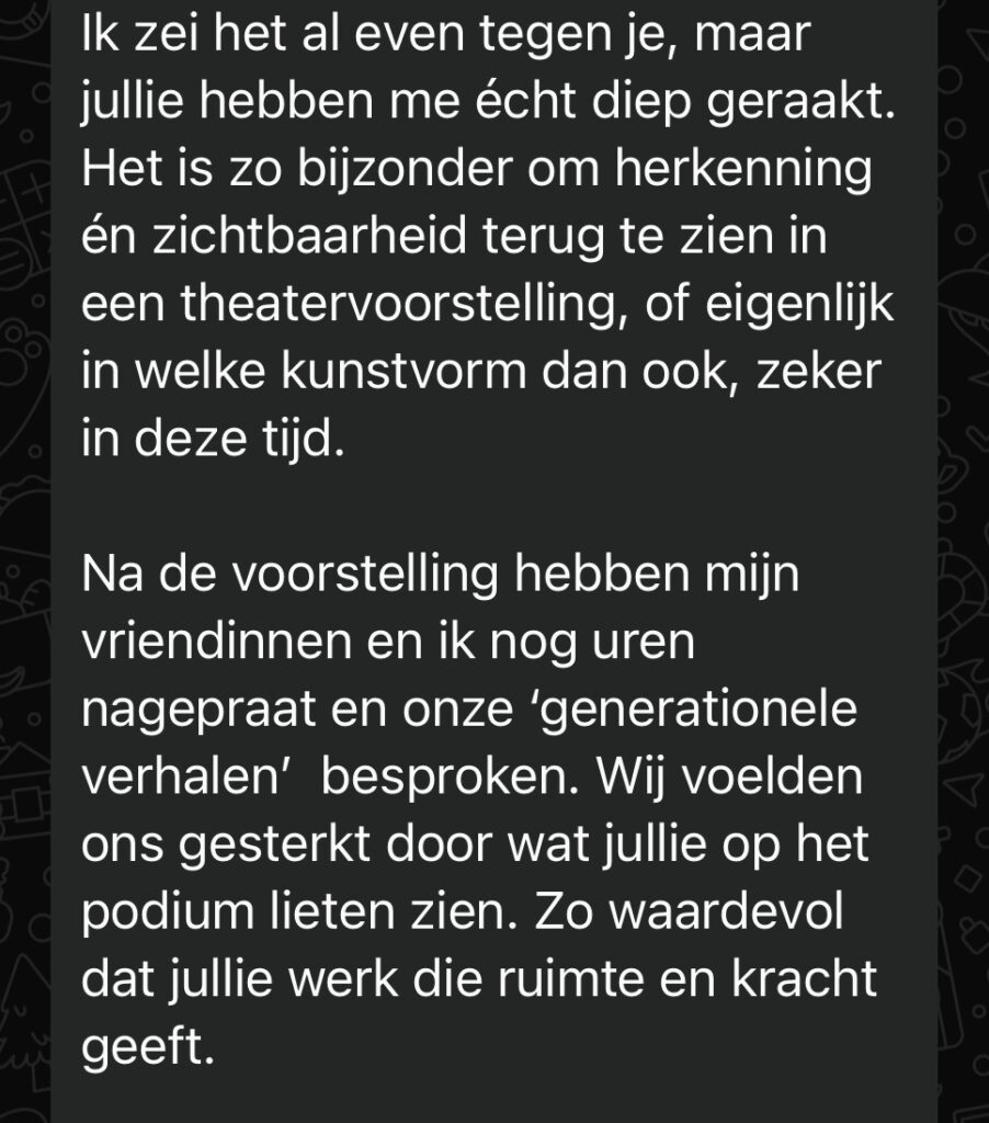De voorstelling maakt de fluisteringen uit het verleden zichtbaar. Verhalen en herinneringen die we al generaties lang met ons meedragen. Trauma’s kunnen zelfs tot zeven generaties doorwerken. Ieder van ons draagt haar geschiedenis met zich mee en wordt er door beïnvloed. In ‘Wat de wind ons vertelt’, durven vier vrouwen terug te kijken, te voelen én te vertellen. Zij kijken niet meer weg.